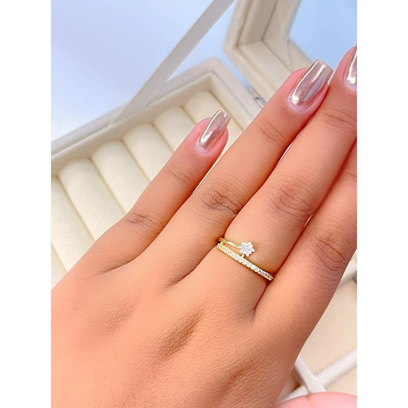 Anel com fio de zircônia e ponto de luz banhado em ouro 18k