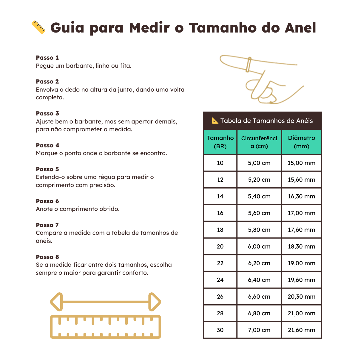Na aba Tabela de Tamanhos, ensinamos passo a passo como identificar o número do seu anel.