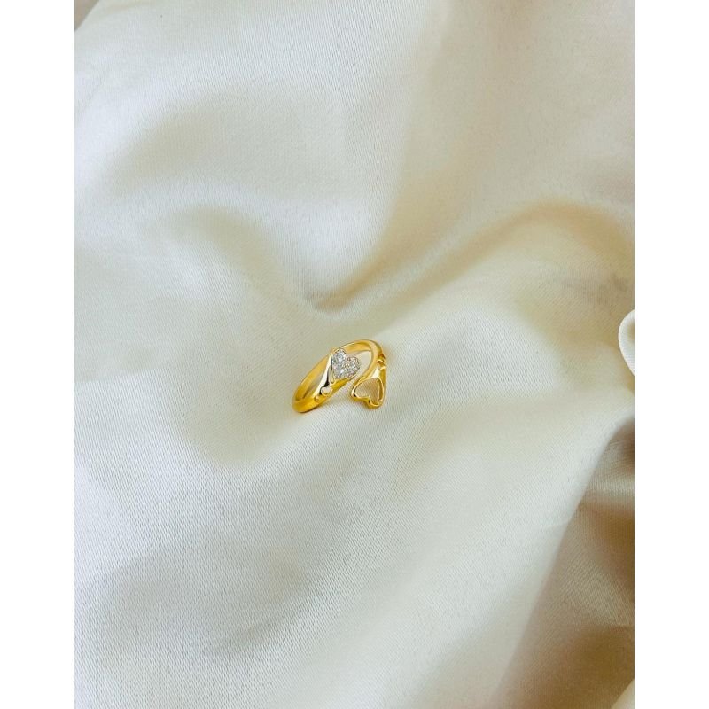 Anel regulável com coração liso e cravejado banhado em ouro 18k