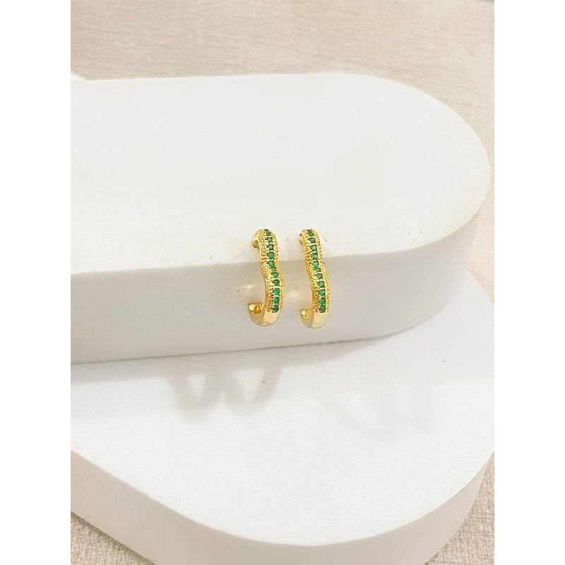 Argola aberta formato coração com pedra verde cravejado banhado a ouro 18k
