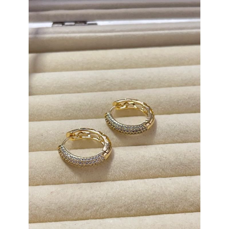Argola oval cravejada e fundo com detalhes vazados banhado em ouro 18k