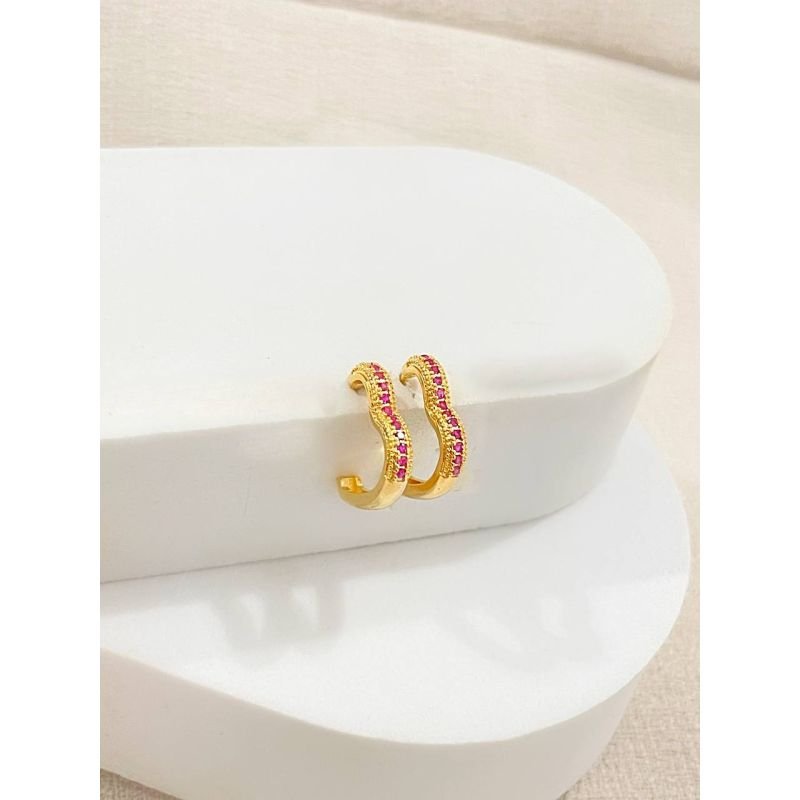 Argola tubo quadrado com fio zircôna rosa banhado a ouro 18k