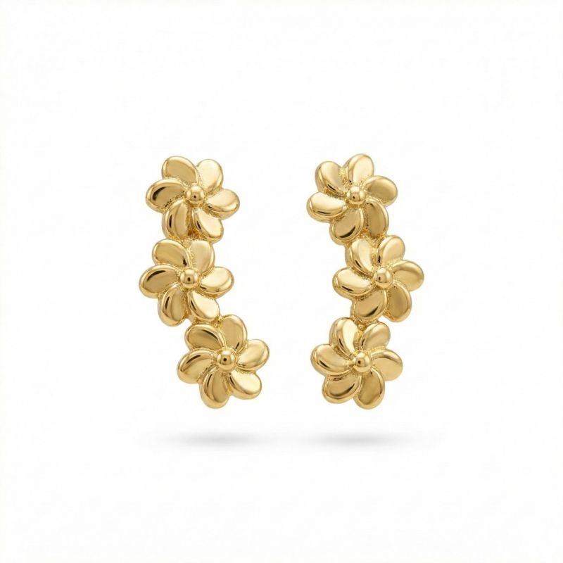 Brinco ear cuff com três florzinhas banhado em ouro 18k