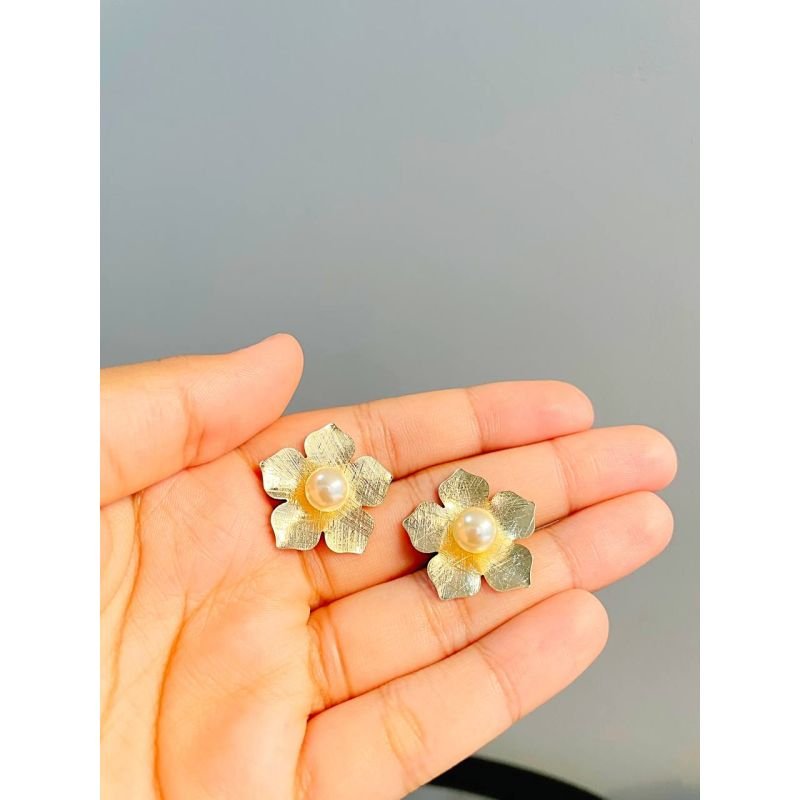 Brinco flor grande texturizada com pérola banhado a ouro 18k