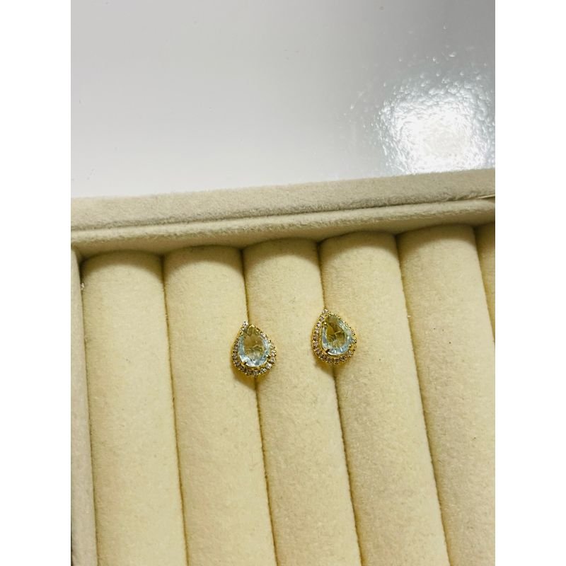 Brinco gota pequena com pedra azul claro e zircônias cristais banhado em ouro 18k