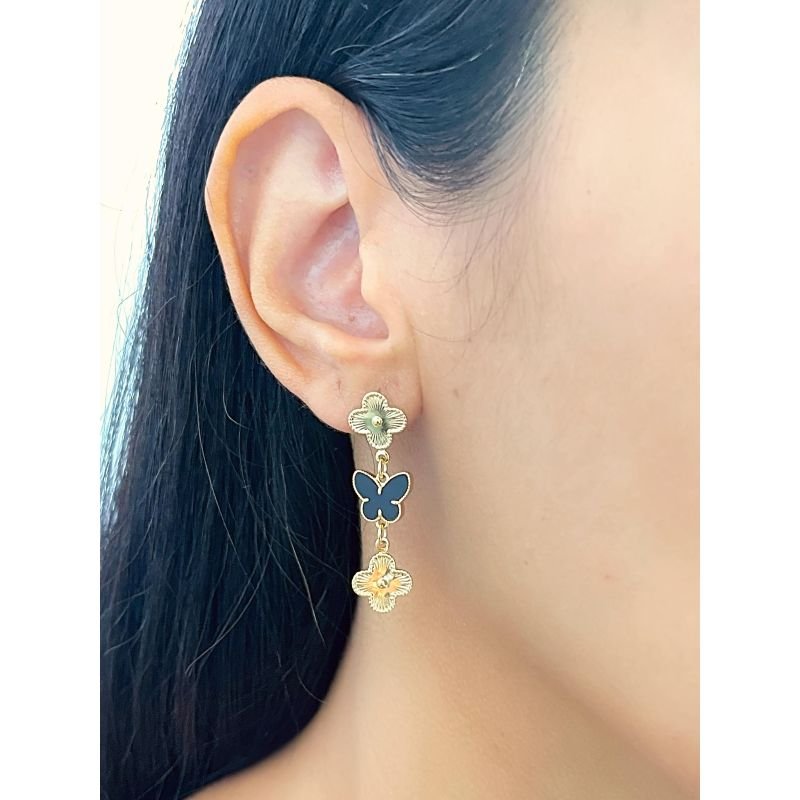 Brinco pêndulo com trevo e borboleta banhado em ouro 18k