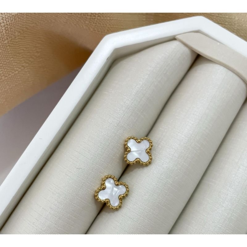 Brinco trevo branco com bolinha banhado em ouro 18k