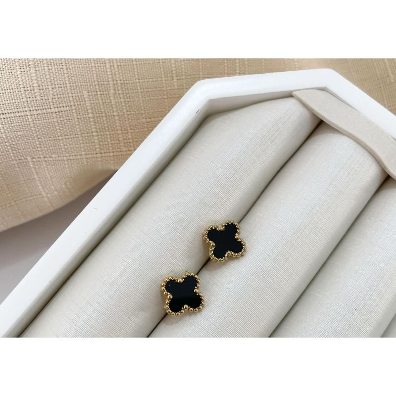 Brinco trevo preto com bolinha banhado em ouro 18k