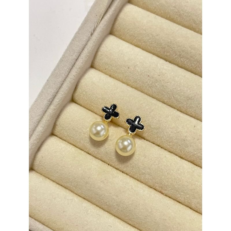 Brinco trevo preto com pérola banhado em ouro 18k