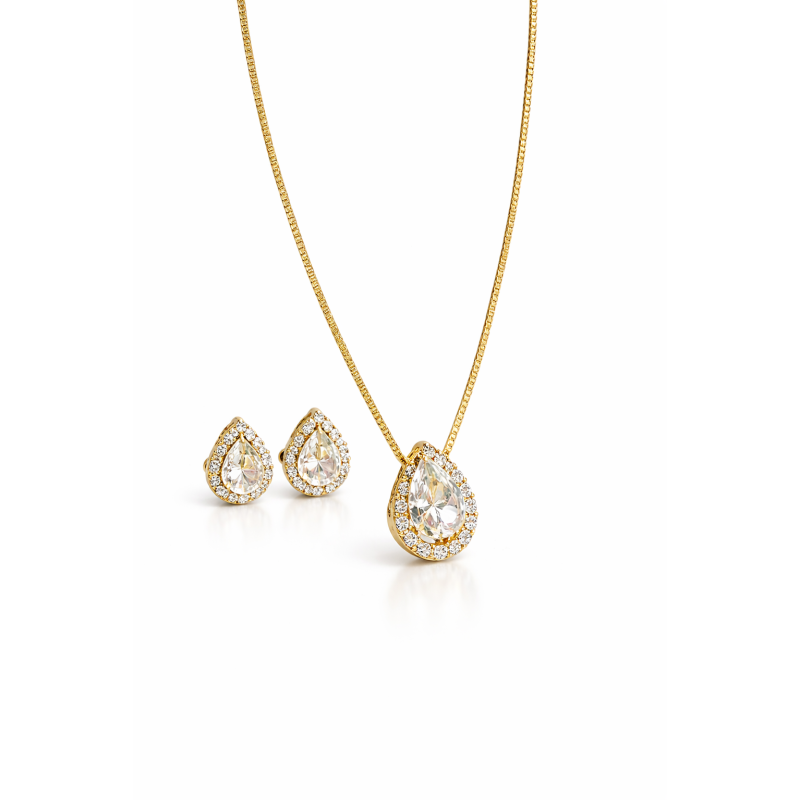 - Conjunto de colar e brinco gota cristal e microzircônias banhado em ouro 18k
