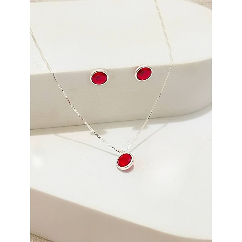 Conjunto de colar e brinco zircônia redonda rubi em prata 925