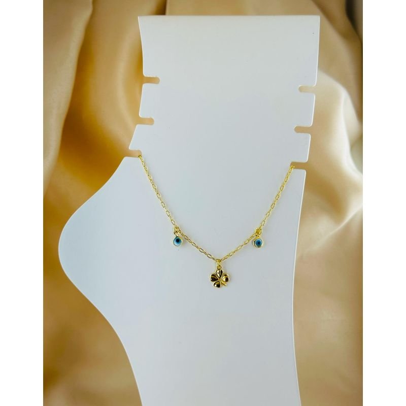 Tornozelira com olho grego e trevo banhado em ouro 18k