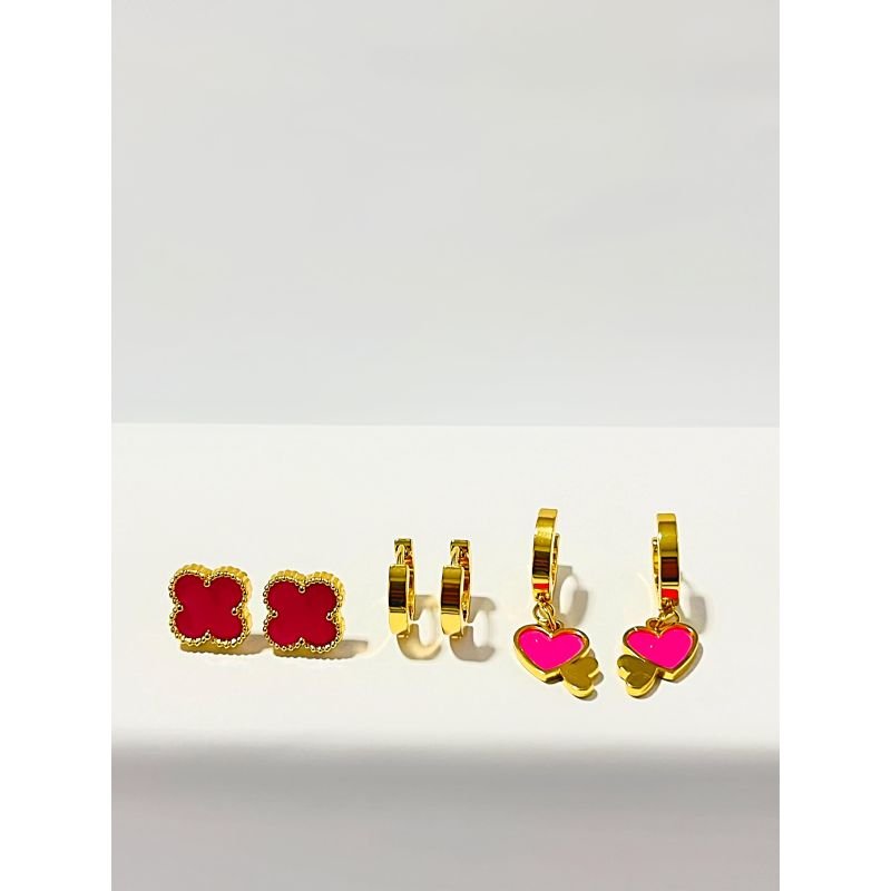 Trio de brinco trevo rosa e argolinha com coração banhado em ouro 18k